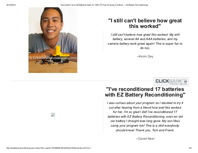 The ez battery reconditioning™ course is the easy to follow, step-by-step system to recondition all kinds of old batteries with just simple supplies you probably already have in your home. the course is made up of step-by-step guides that show you how to recondition each type of battery.. It is a program which is purposely tailored to teach folks to understand the ez battery reconditioning method. as the name suggests, it is easy to understand and comprehend. the program will encourage you to recondition the dead battery rather than throwing it out.. Ez battery reconditioning program not scam is specifically developed to teach people how they can recondition dead or defunct batteries to save a whole lotta cash or sell them for massive profit..